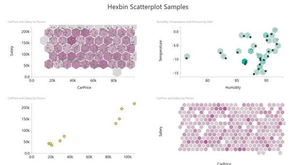 La visualización personalizada Hexbin Scatterplot de David Eldersveld muestra los puntos en la parte superior de los “contenedores” hexagonales. El color de cada hexbin se basa en la densidad de puntos dentro de cada bin, con contenedores más oscuros que muestran más puntos. Puede controlar con este visual si aparecen los puntos, solo los contenedores o ambos, además de tener control de formato sobre ambos.
